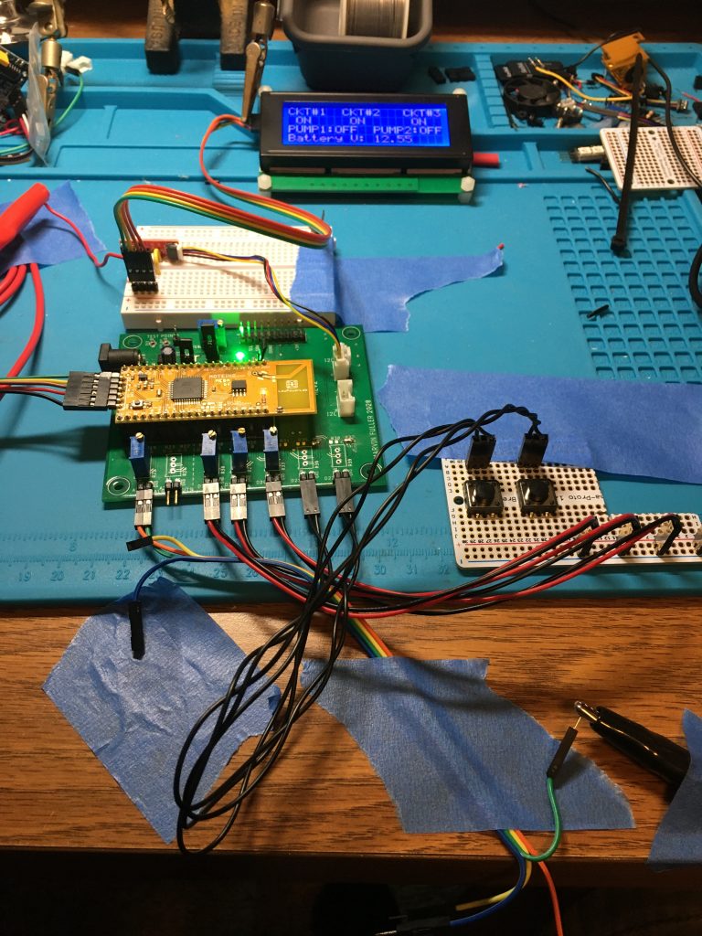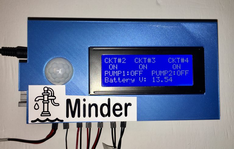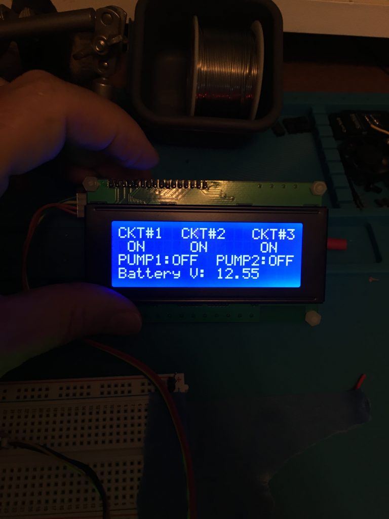I felt that this device needed a easy to read display with all the vital information. I chose a simple approach of a reliable 20 characters x 4 line LCD display. As shown I display the status of mains power, the current pump status as well as the backup battery voltage. To avoid having the LCD back light on at all times, I added a couple transistors to switch the LCD back light on whenever motion is detected and then turn the back light off after a few minutes of no motion.